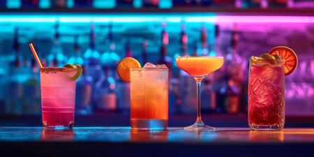 Line of many colorful alcoholic cocktails on a bar in a nightclub on dark background. Generative AI