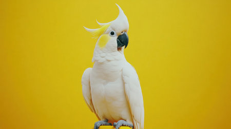 A white cockatoo with a striking yellow crest stands elegantly on a perch in a clean studio environment, showing its beauty against a vivid yellow backdrop.