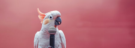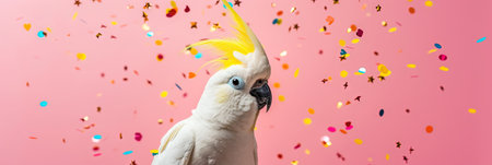 Cockatoo with colorful feathers and confetti on pink background