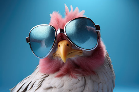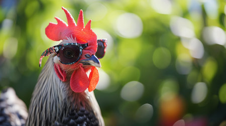 Stylish chicken dons sunglasses, posing with a vibrant bokeh backdrop