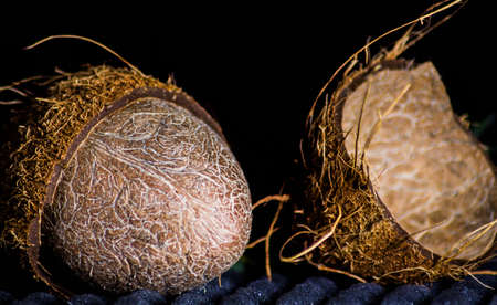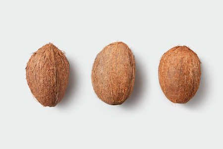 Set from ripe natural organic exotic coconut fruit two whole and one half on a brown background with soft shadows and copy space. Vegan concept. Top view.