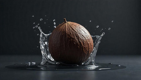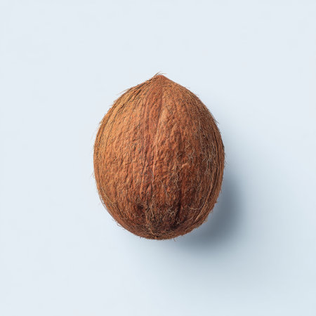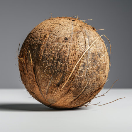 A rustic coconut shell on a clean minimalist background highlights earthy textures and organic patterns, perfect for projects focused on nature and sustainability.