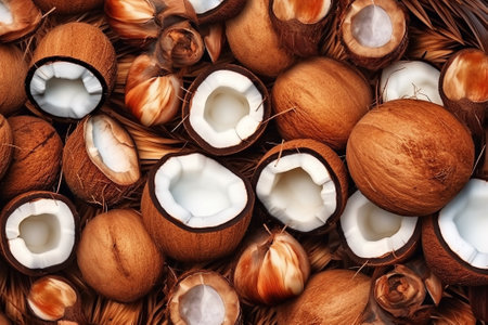 Close-up perspective of a coconut pile, revealing freshly cut halves with detailed white and brown contrasts