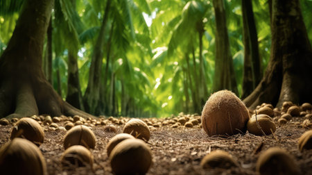Natures Bounty: Vibrant Brown Coconut Fruits Gracefully Adorn the Ground --ar 3:2