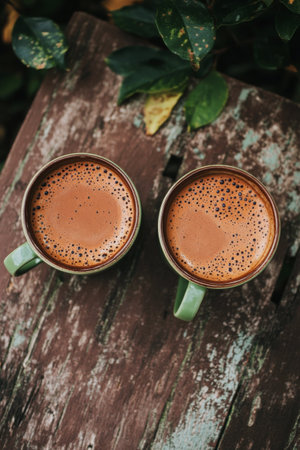 Two cups of rich, aromatic coffee are set on a rustic wooden surface, framed by vibrant green leaves, evoking a cozy and inviting atmosphere.