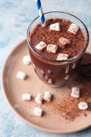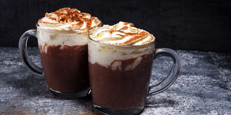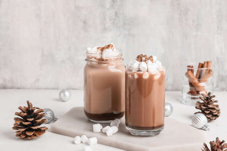 Cocoa chocolate and milk drinks with mini marshmallows in tall glasses on gray background. Festive holidays food concept.