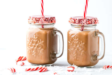 Hot chocolate milk on white enamel mug with colored stick roll.