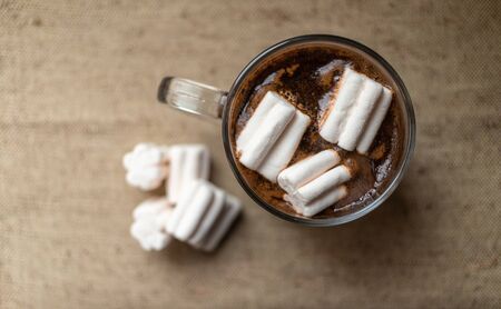 hot warming chocolate with marshmallows on wooden table served on cloth copy space