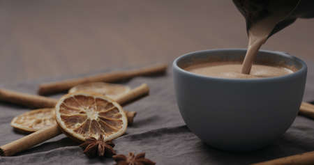 closeup pour cocoa drink into blue cup on walnut table with christmas decorations and copy space