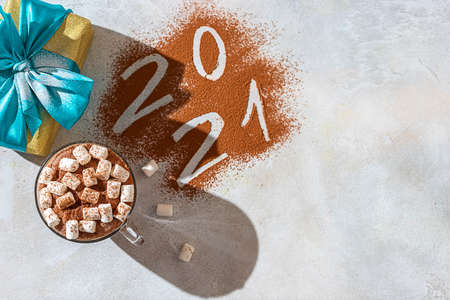 Cup of hot cocoa with marshmallows and numbers 2021 from cocoa powder. The concept of cozy holidays and New Year. Background with place for text