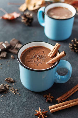 Spicy hot chocolate with cinnamon and star anise in enamel blue mugs on black background. Beverage in a cold autumn weather.