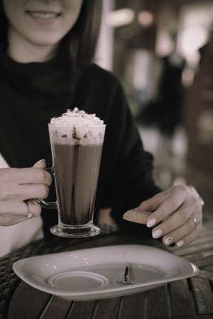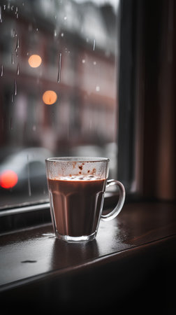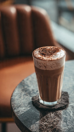 A mug of hot chocolate is placed on the table in the cafe, giving it a warm atmospher