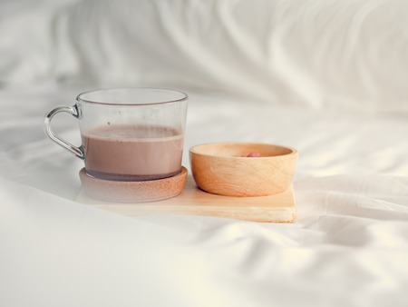 Small snacks set of salted beans and hot chocolate served on the bed in the morning.