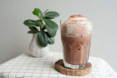 Hot chocolate cocoa with whipped cream for xmas on table.