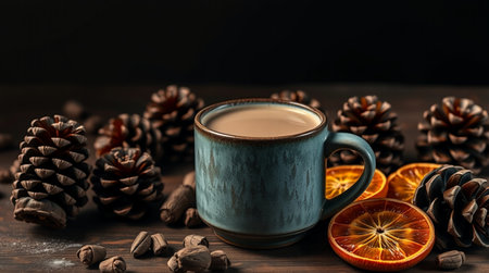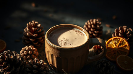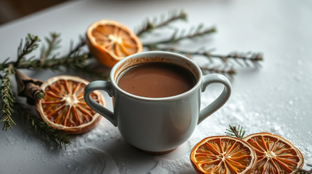 Winter Christmas beverage on the background of fir branches and garland lights on a wooden table.