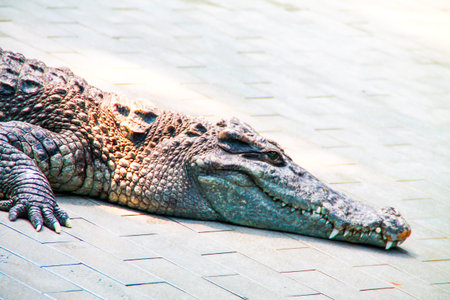 beautiful specimen of nile crocodile lying on the ground relaxed in a zoo in valencia spain