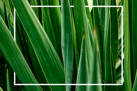 Background with a white frame and copyspace for the design. The green juicy leaves of the yucca palm. side view.