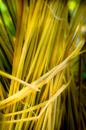 golden palm tree frond outdoor under the sunlight with backyard bokeh, close-up shot at shallow depth of field
