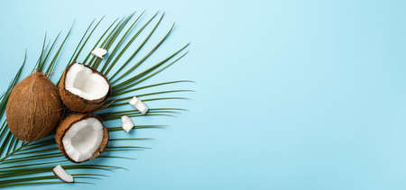 Summer weekend concept. Top view photo of cracked coconuts and palm leaves on isolated pastel blue background with copyspace