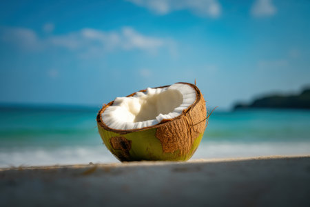 A halved coconut sits on a sandy beach with the turquoise ocean and blue sky in the background.
