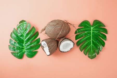 Two halves of fresh raw coconut on pink backgound with green monstera leaves on white. Trendy concept