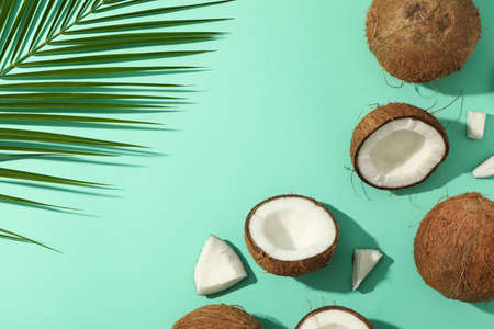 Flat lay with coconut and palm branch on mint background, top view