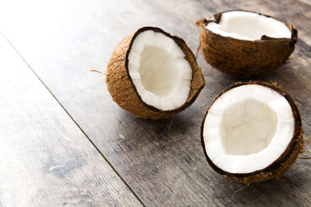 Half coconuts fruit on wooden background