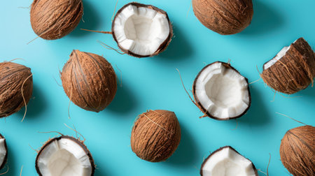 Various coconut halves arranged in a flat lay pattern on a blue surface.