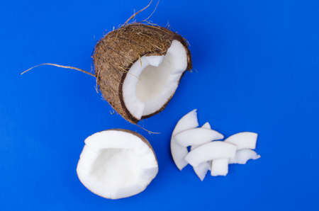 Fresh coconut lies on a blue background with small pieces of acocosis. Coconut shavings. View from above.