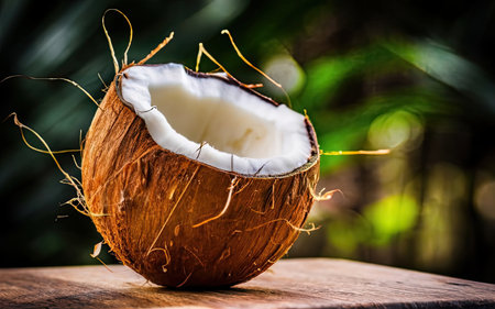 Fresh opened coconut on the brown table