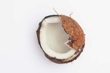 Ripe coconut cut on two half isolated on white background. Fresh fruit, ingredient for cooking food or beauty self care