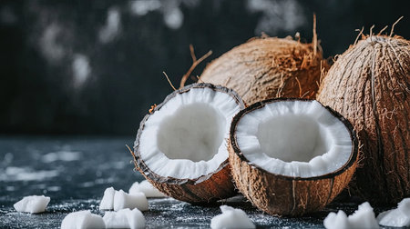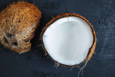 Whole and a half of cracked coconut on dark concrete background. Copy space, top view