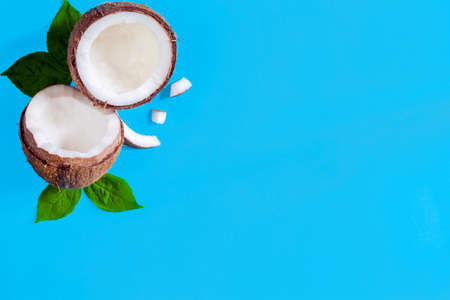 Coconut halves, shavings, green leaves are in left corner of blue background. Summer tropical exotic fruits for cooking alternative milk. Natural healthy organic vegan vegetarian meal food concept.
