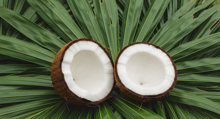 Two halves of a fresh coconut showing white meat, resting on a background of fan-shaped green palm leaves. The symmetrical composition highlights the tropical and natural theme.