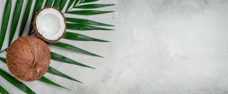 Coconuts with palm leaf on gray concrete background. Top view, copy space.