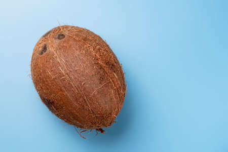 Whole coconut on a blue background. Place for text.