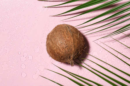 Tasty coconut and palm leaves on color background with water drops