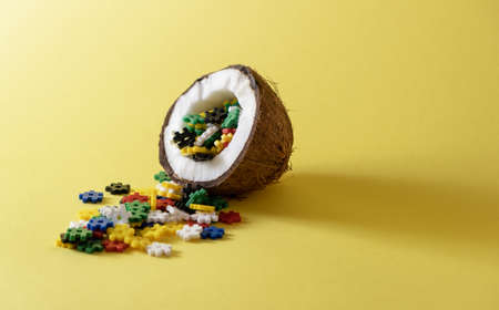 Sliced ​​coconut with colored puzzles on a yellow background