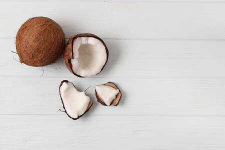 broken coconut on a colored background top view.
