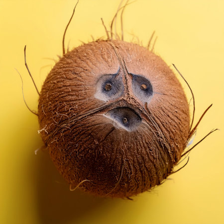 A detailed closeup of a brown coconut resting on a bright yellow background. The simple composition highlights the texture and organic shape, perfect for food and nature themes.