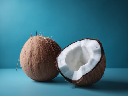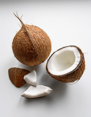 AI Generated. Two coconuts sit side by side on a white surface One is split in half