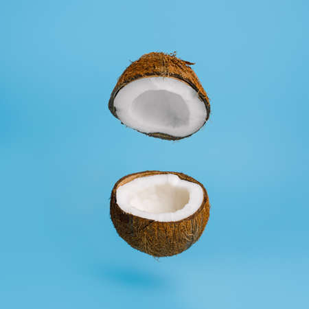 Coconut split on half with one half floating in air. Blue background. Creative food concept
