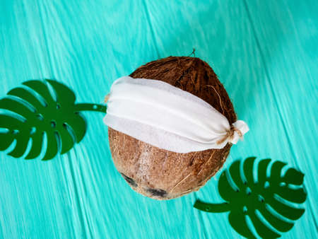 the concept of a global pandemic coronavirus, coconut in a homemade mask to sit at home in the country close.