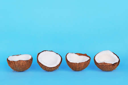 Halves of coconuts in peel on blue background. Flat lay minimal trendy photo with copyspace.