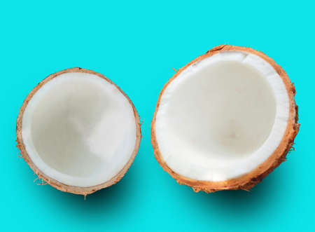 Top view, Half coconut isolated on cyan background, food and drink, condiment, dessert, ingredient