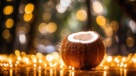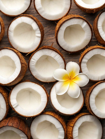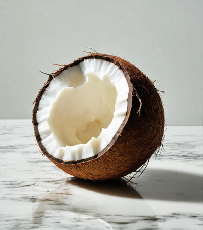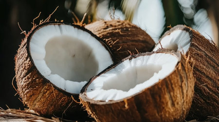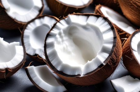Freshly cracked coconut halves revealing creamy, luscious insides. Perfect for tropical vibes, natural beauty, and healthy culinary inspiration. Generated AI.