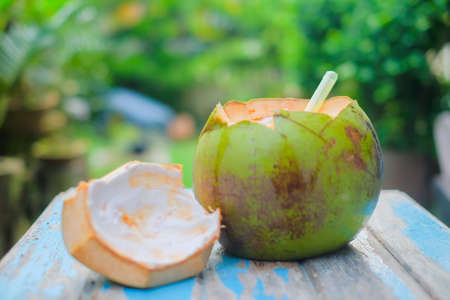 Fresh Coconut with straw on old wood with blurred background