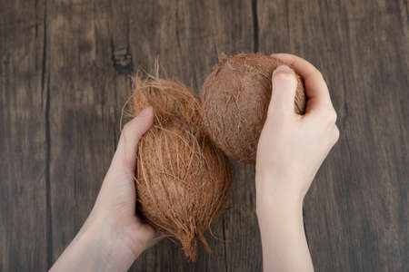 Female hands holding ripe coconuts on wooden surface