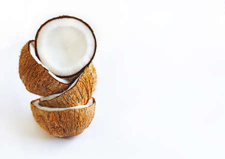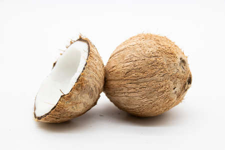 Ripe coconut halves isolated on white studio background. Broken exotic nut cutout
