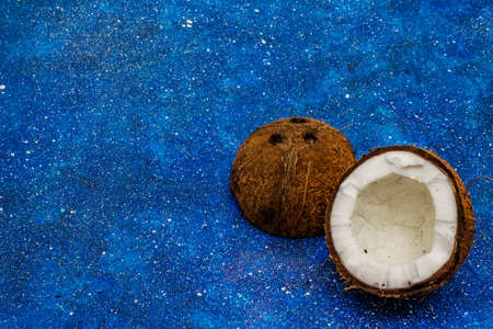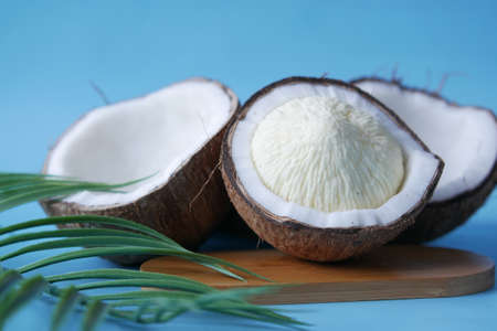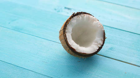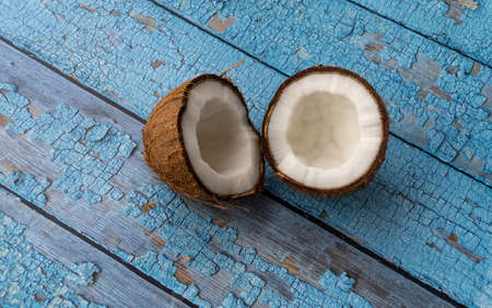 split coconut on blue wooden planks. Coco, ripe palm fruit.